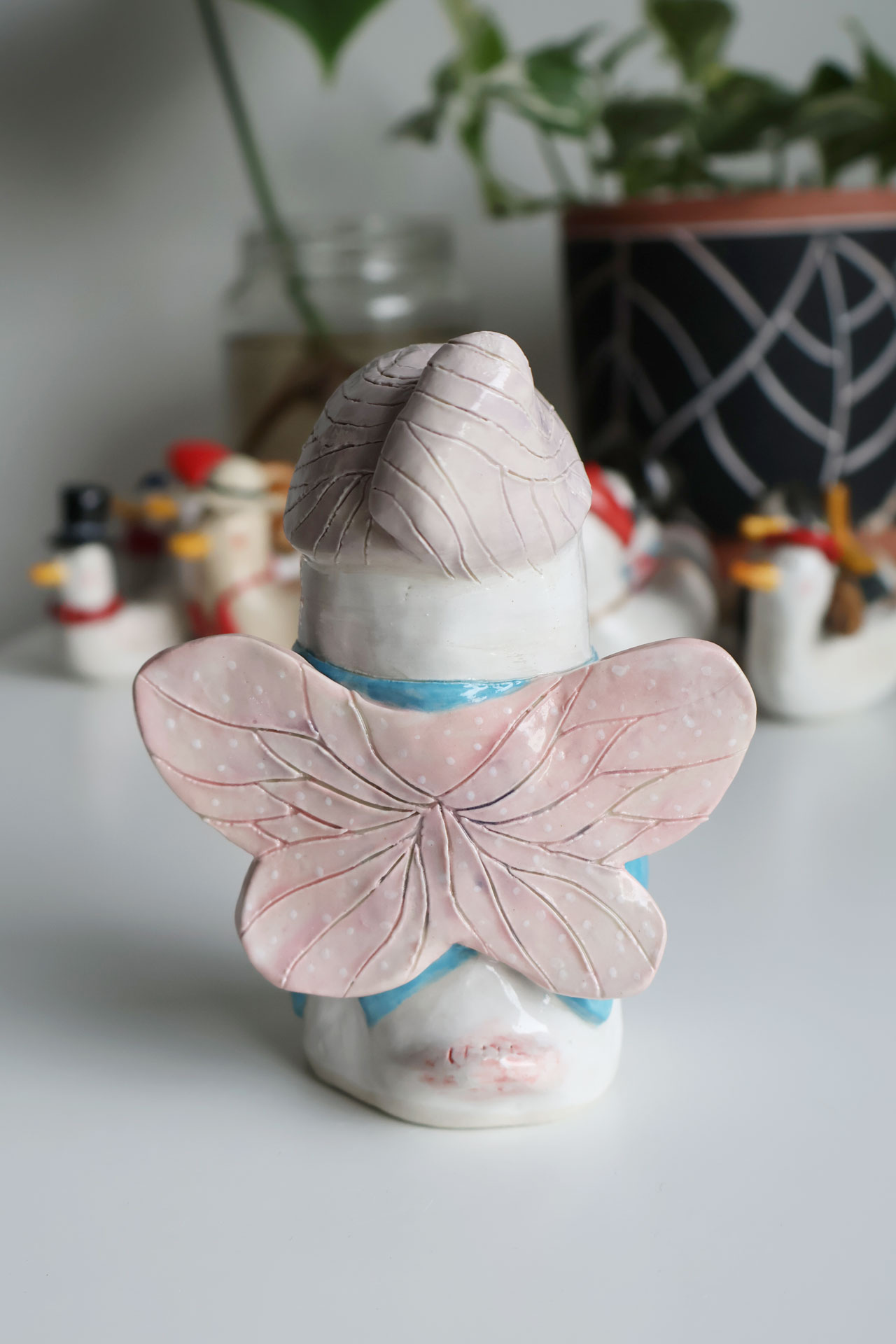 This figurine was hand built with white stoneware clay, decorated with coloured underglazes and finished with a clear glaze.